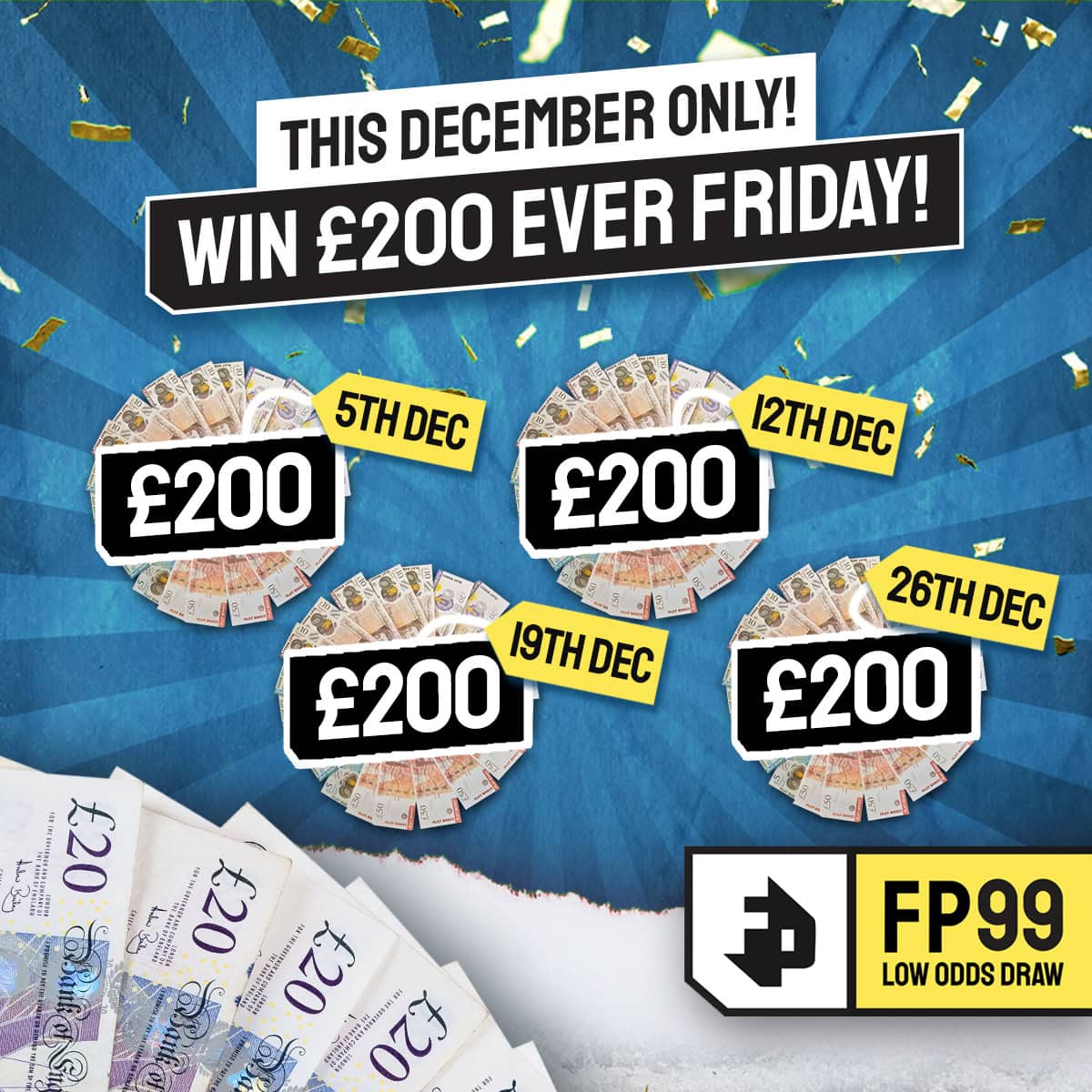 £200 deposited 5th, 12th, 19th & 26th December! Low odds Draw! Maximum 99x Entries!