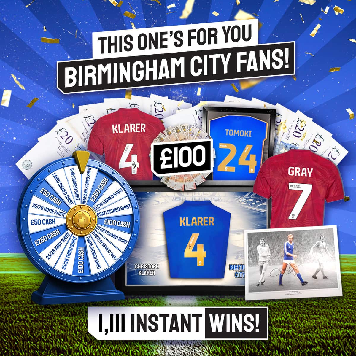 Win a spin on the Birmingham City wheel of prizes, cash, signed shirts & more!